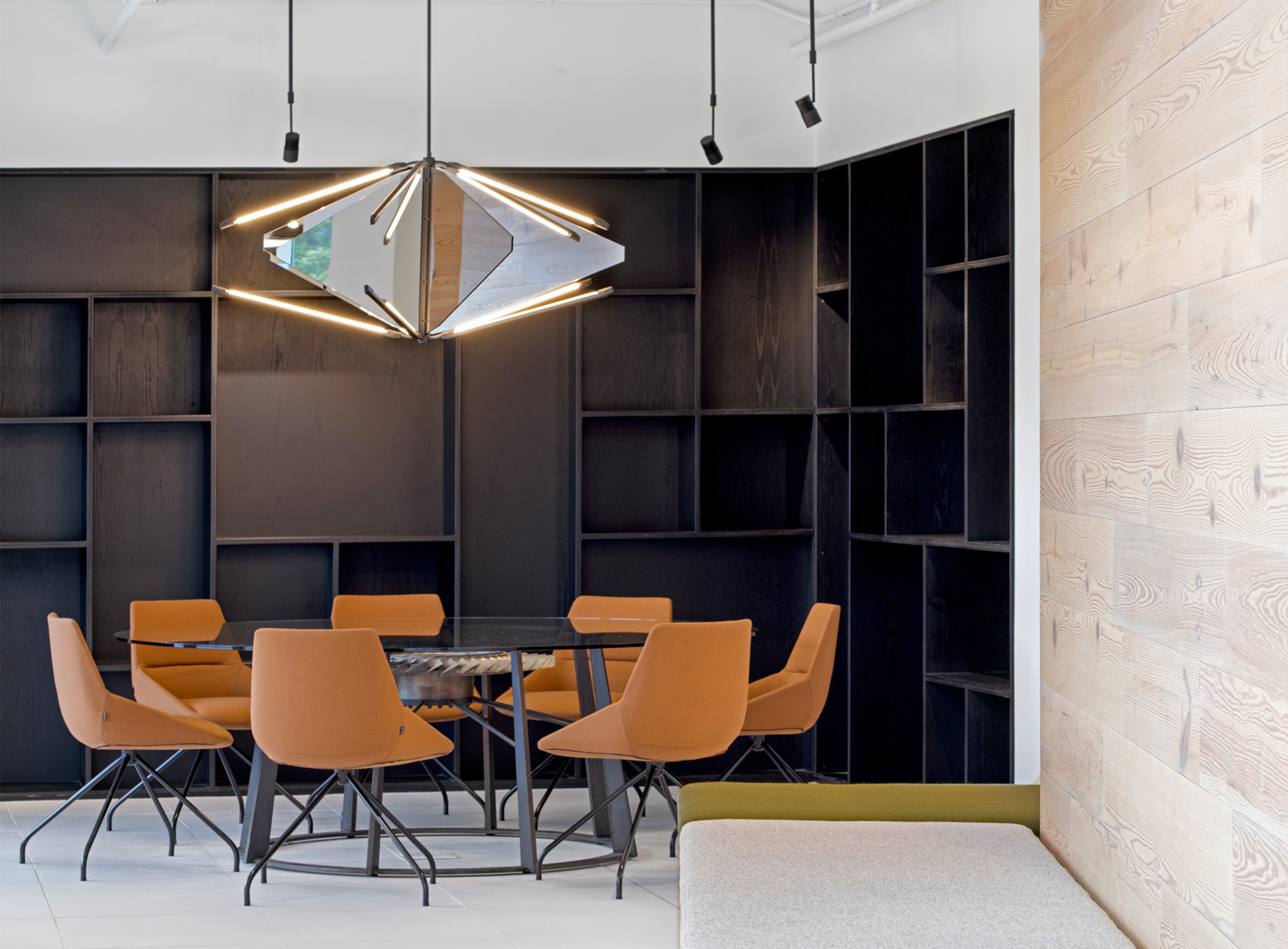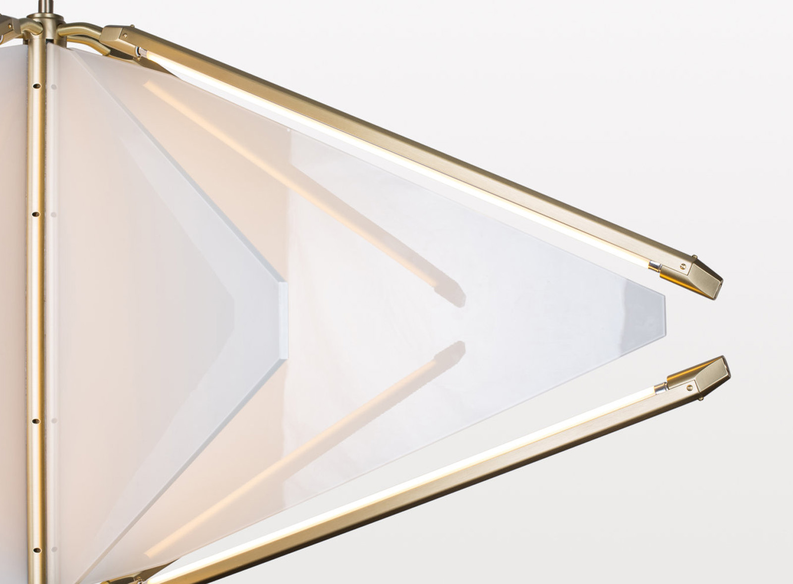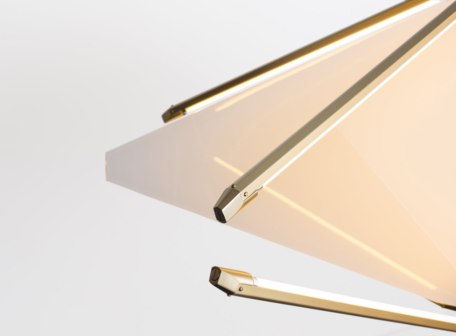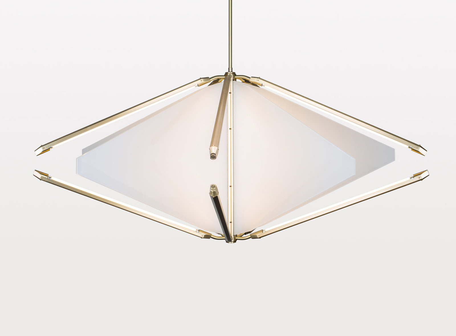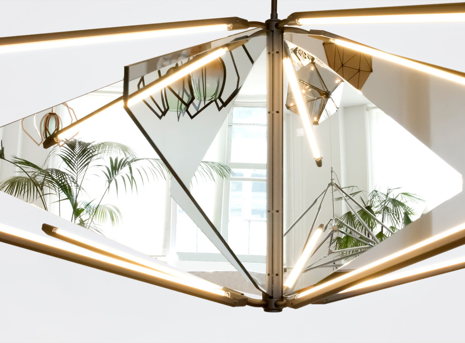 Echo uses mirrored fins, radiating from a central axis, to reflect beams of light. LED tubes are turned inward to bounce off the mirror, thereby softening and amplifying that light. Echo is also available with glass fins, which diffuse the light, creating a soft glow.