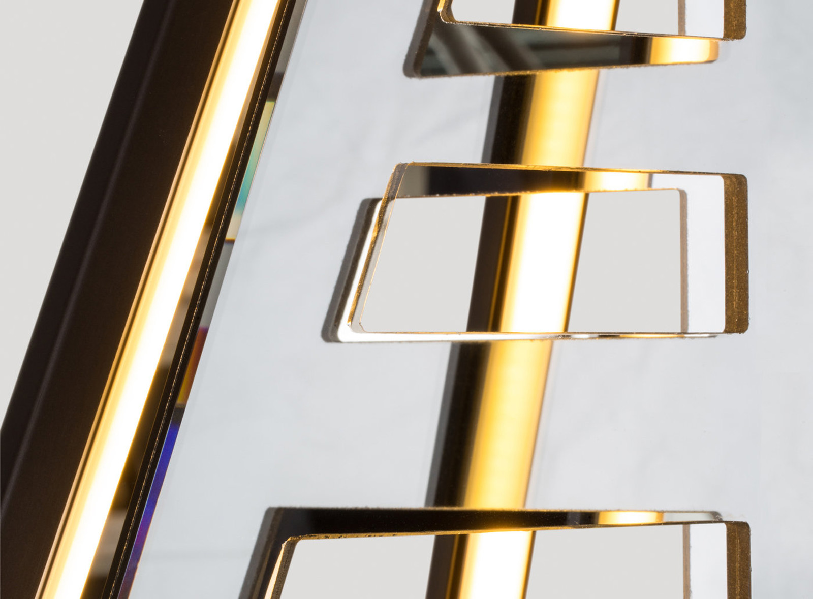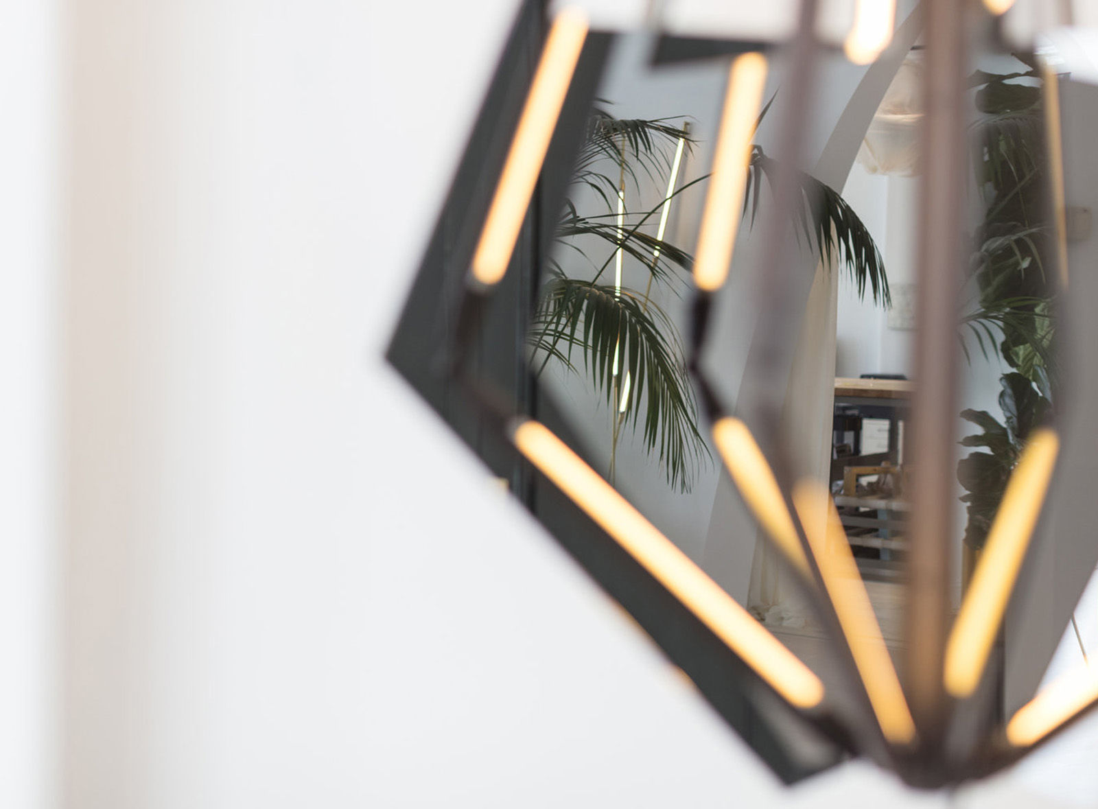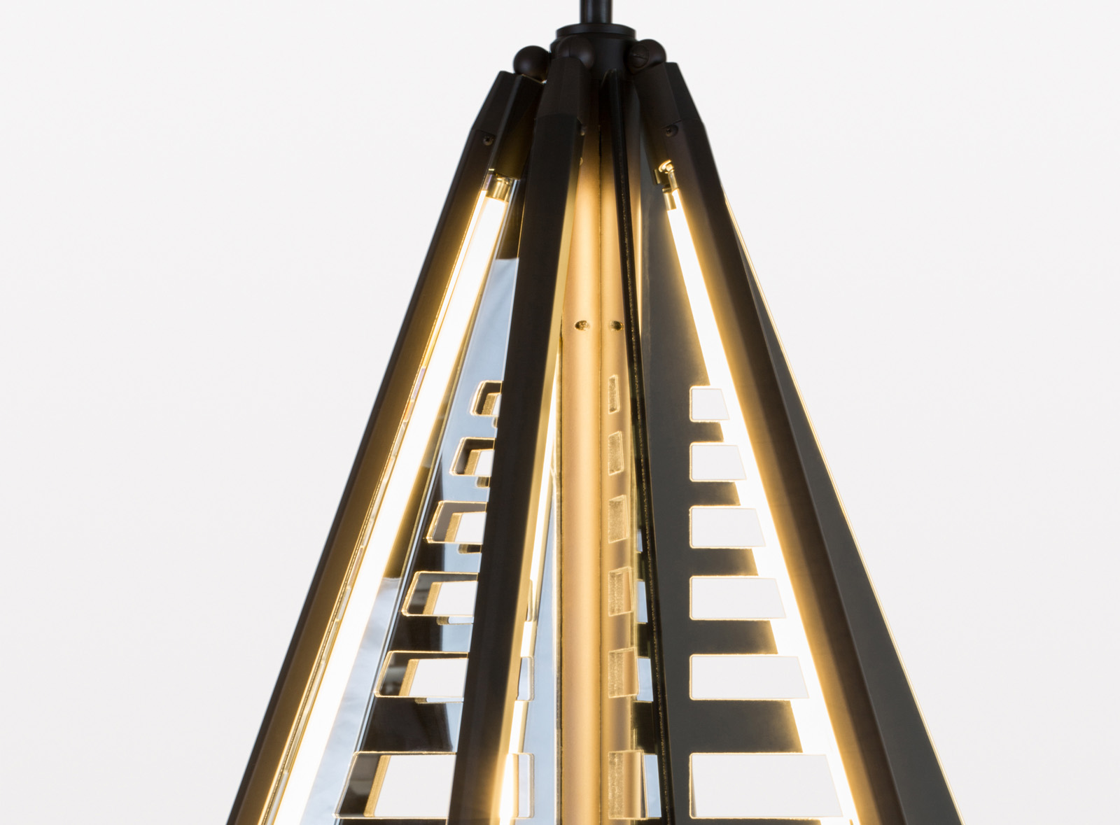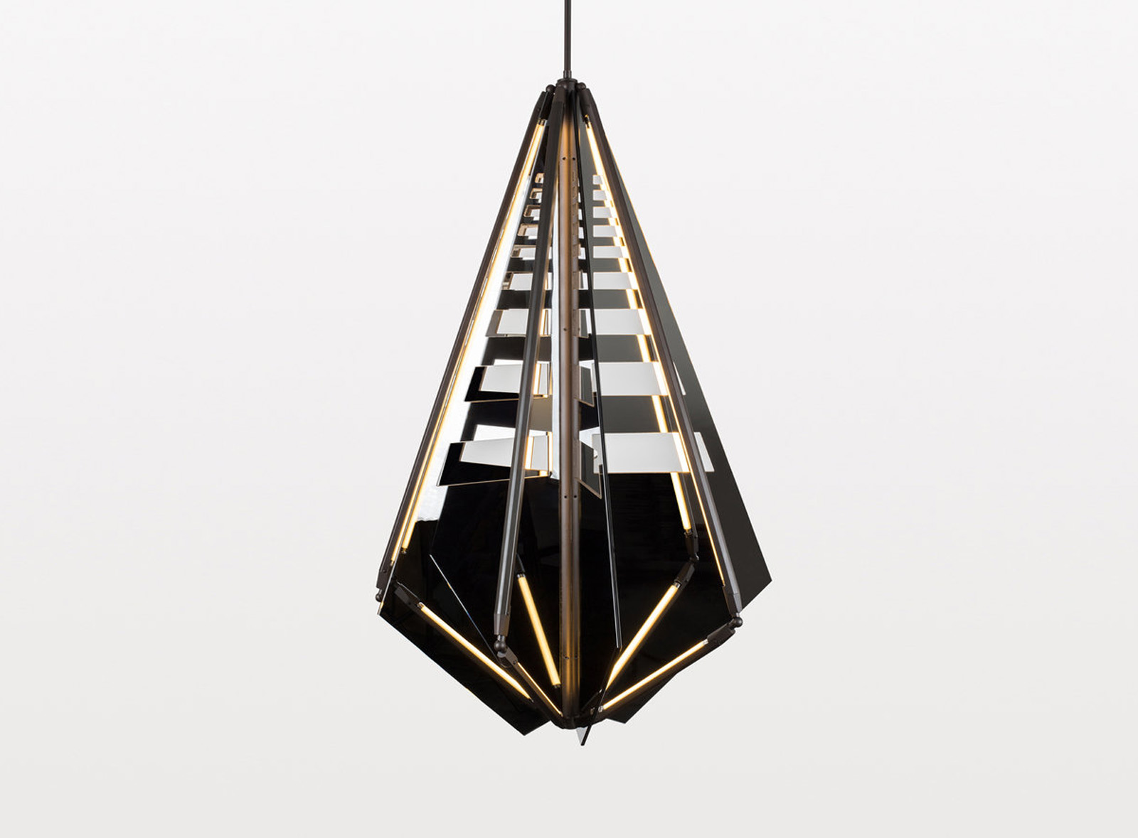Echo uses mirrored fins, radiating from a central axis, to reflect beams of light. LED tubes are turned inward to bounce off the mirror, thereby softening and amplifying that light. Echo is also available with glass fins, which diffuse the light, creating a soft glow.