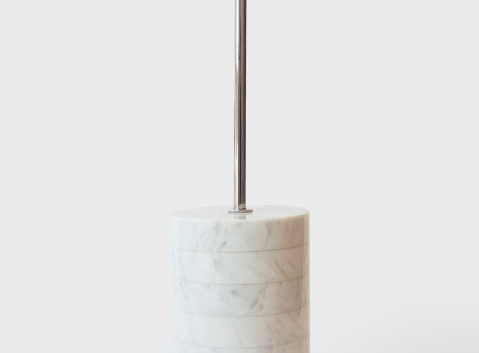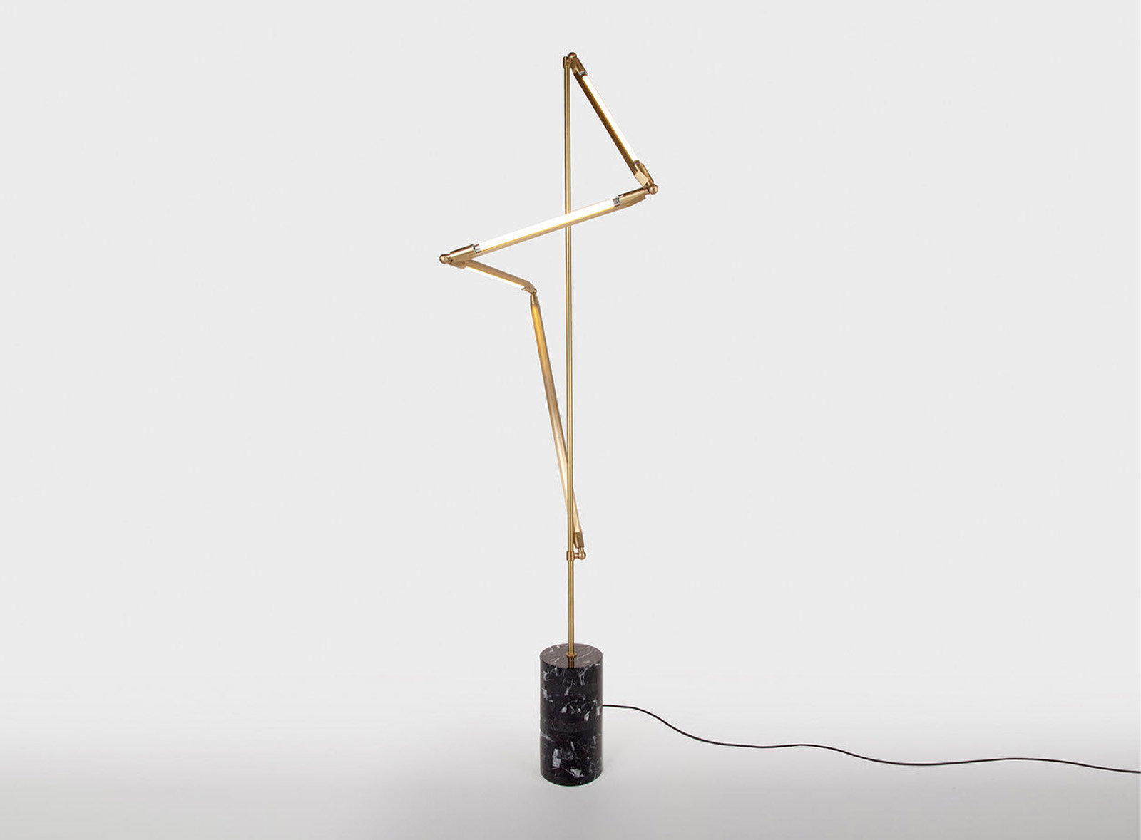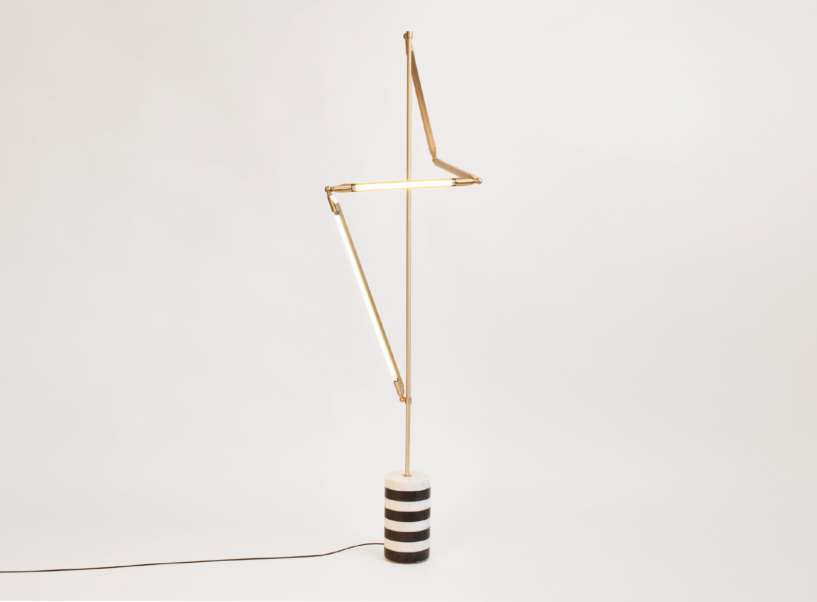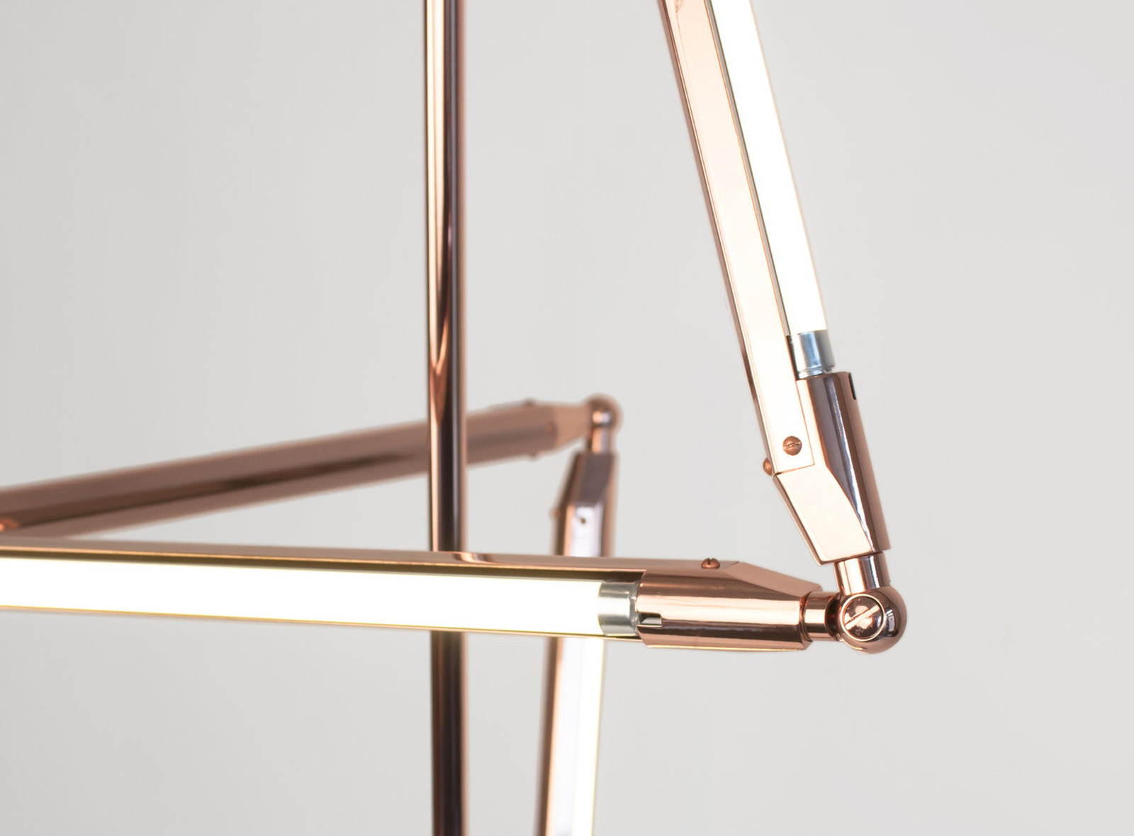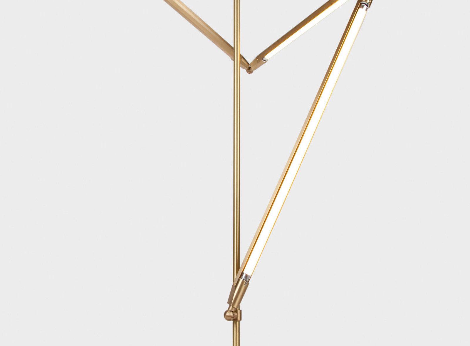 Helix is composed of custom brass hardware and LED tubes that wrap around a central support in a lean, angular composition. Helix is available with a stone counterweight for hanging fixtures, and in any of our standard brass finishes.