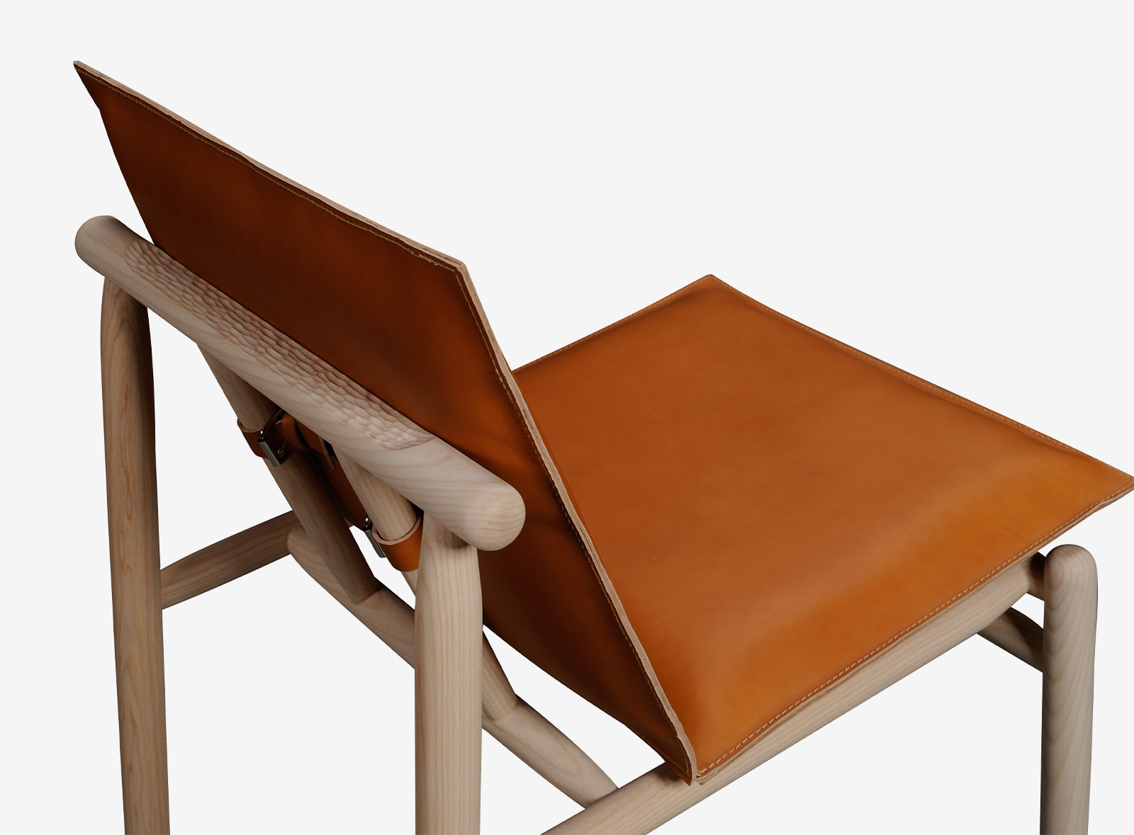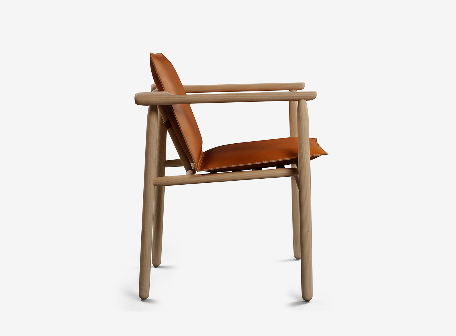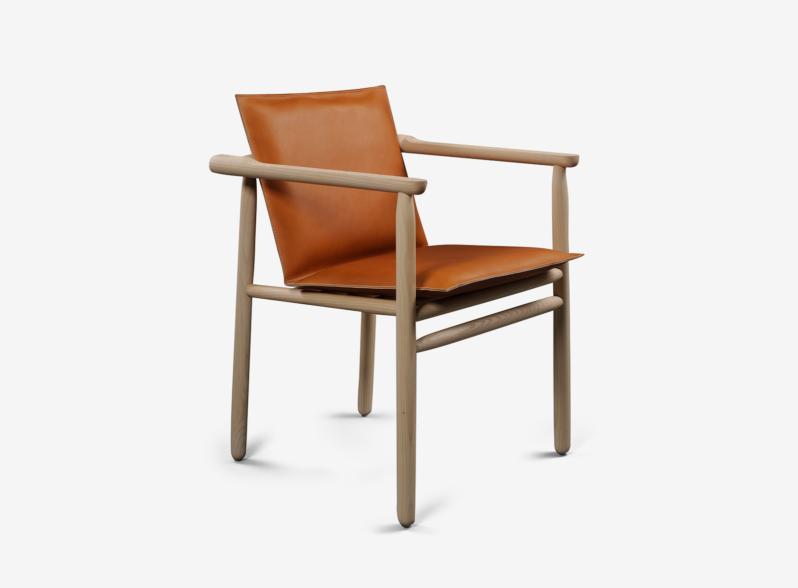 Igman dining chair is soft and lightweight chair that combines a solid wood frame and a removable soft seat & backrest upholstered in either vegetable-tanned 2,2 mm thick saddle leather or a choice of fabrics. The chair comes in a version without armrests and with armrests. The hand-carved details on the flat-cut surfaces of the armrests and the back beam add to the chair’s character and tactility. Design: Harri Koskinen.