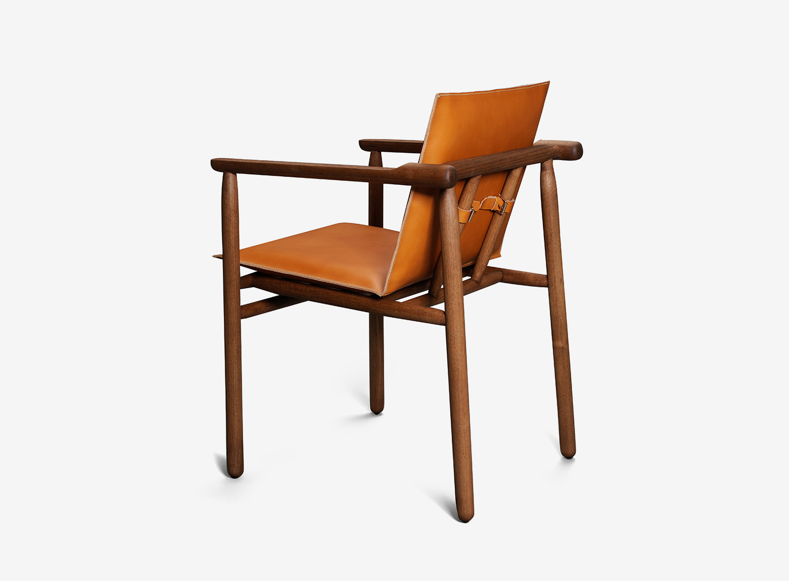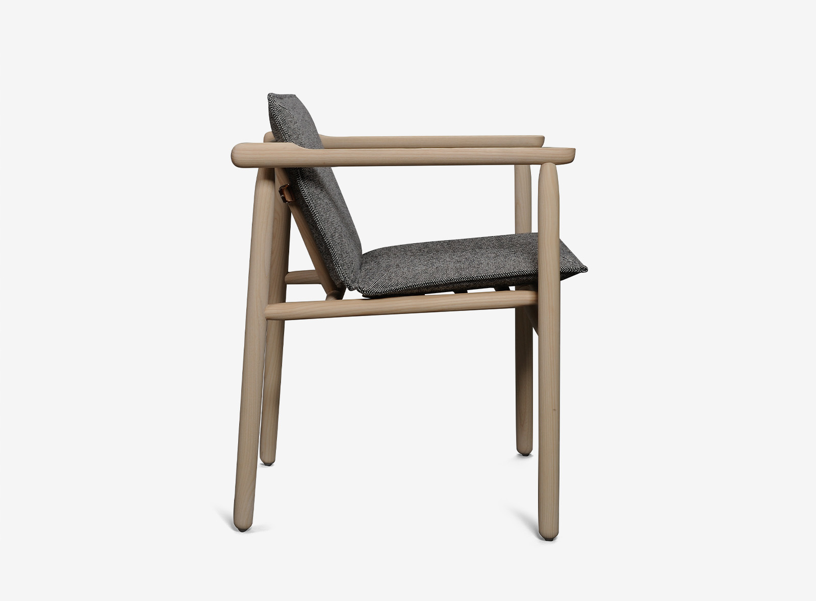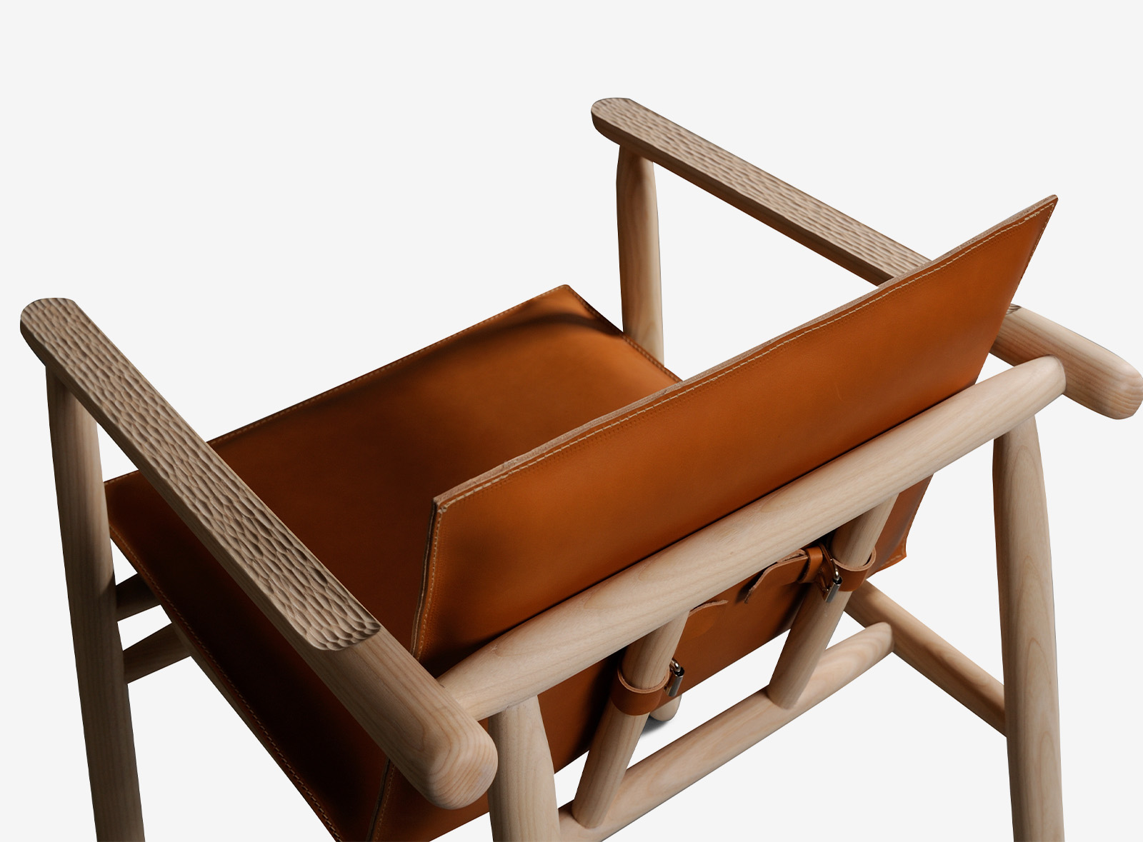 Igman dining chair is soft and lightweight chair that combines a solid wood frame and a removable soft seat & backrest upholstered in either vegetable-tanned 2,2 mm thick saddle leather or a choice of fabrics. The chair comes in a version without armrests and with armrests. The hand-carved details on the flat-cut surfaces of the armrests and the back beam add to the chair’s character and tactility. Design: Harri Koskinen.