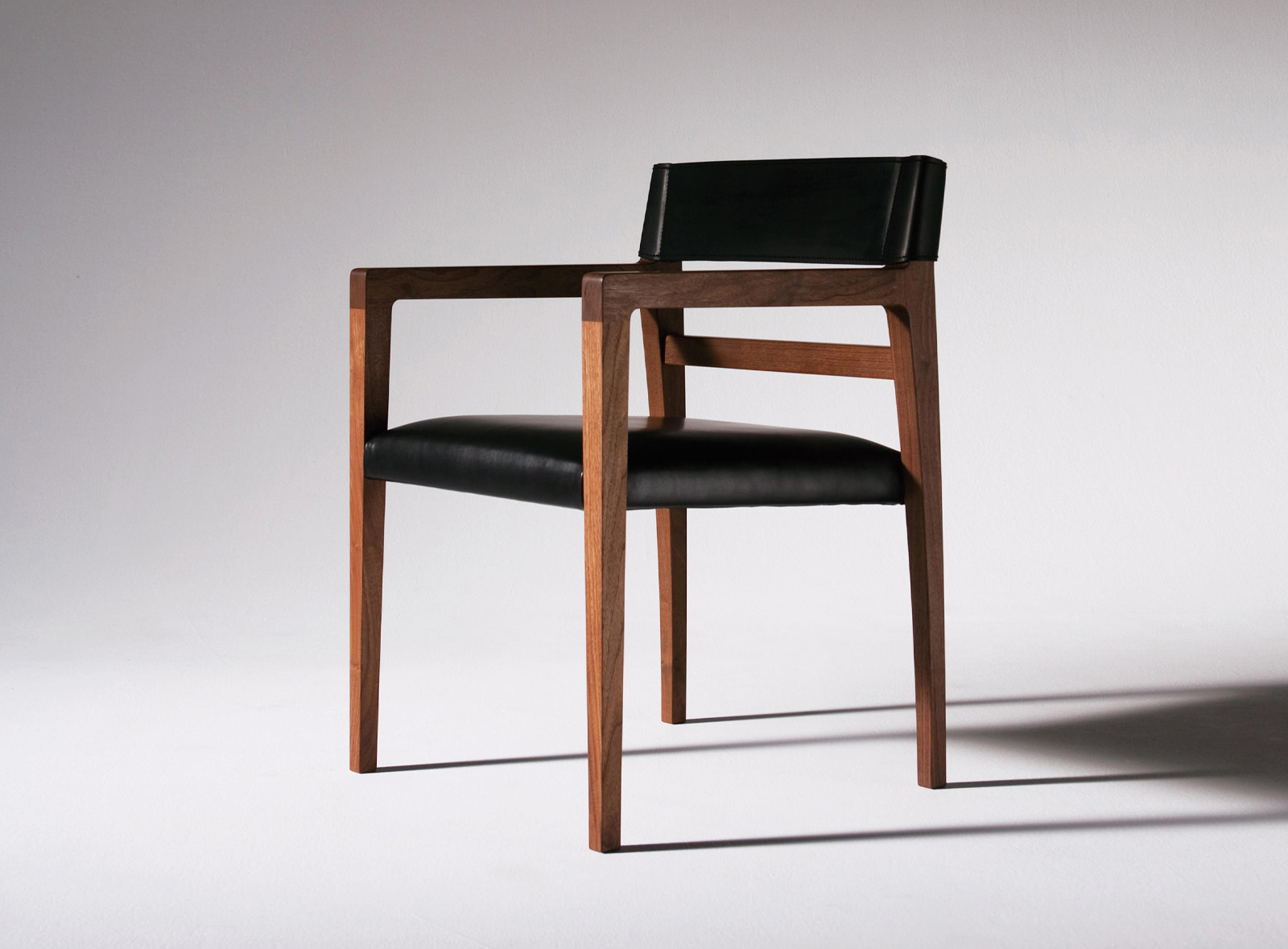 JK is an armchair, which is characterized by its elegance and its clear lines design. The structure is created in oil walnut with seat and back upholstered in black leather. This collection was originally designed by Japanese architect Jun Kamahara in 2004. Design: Jun Kamahara.
