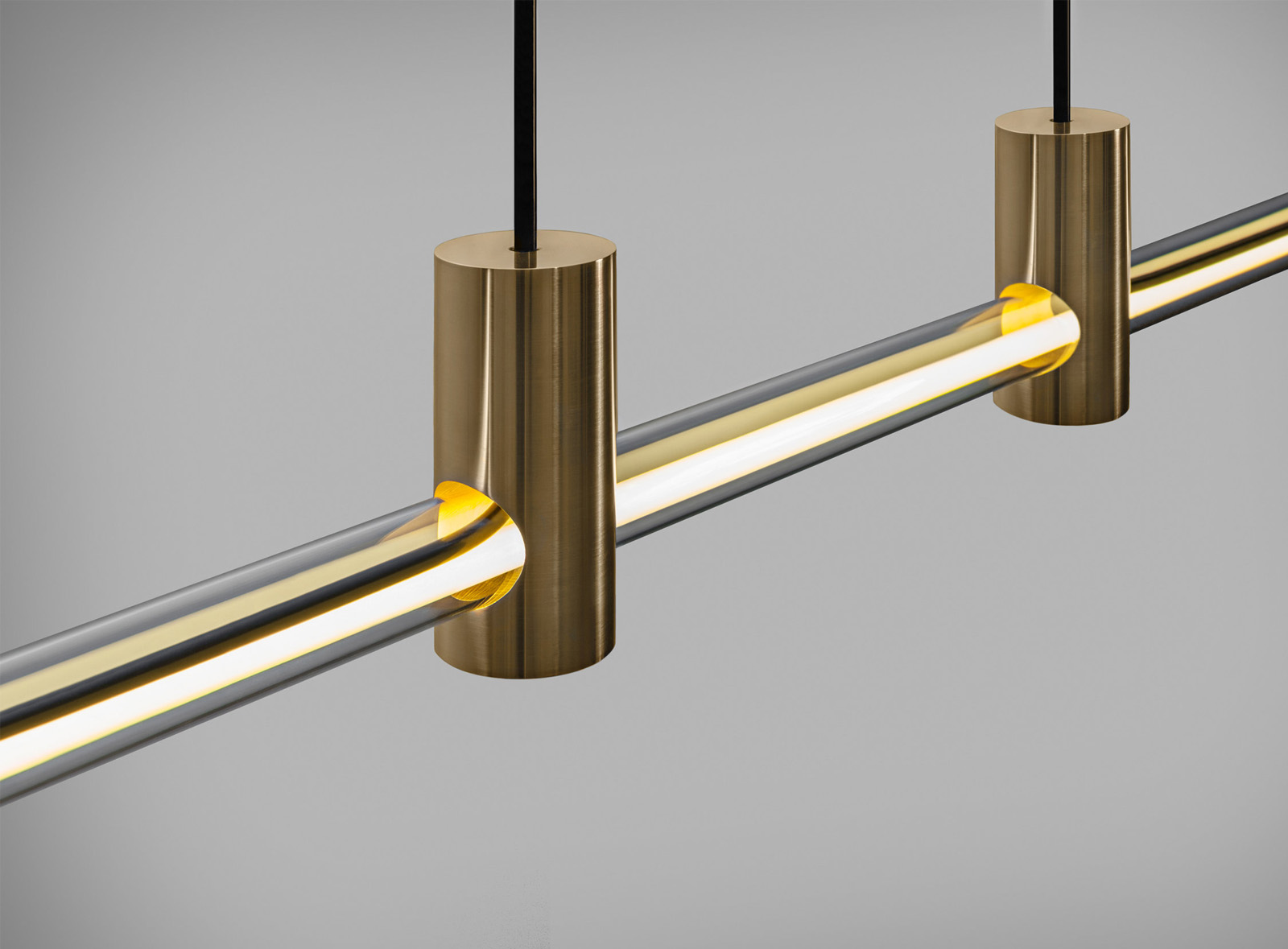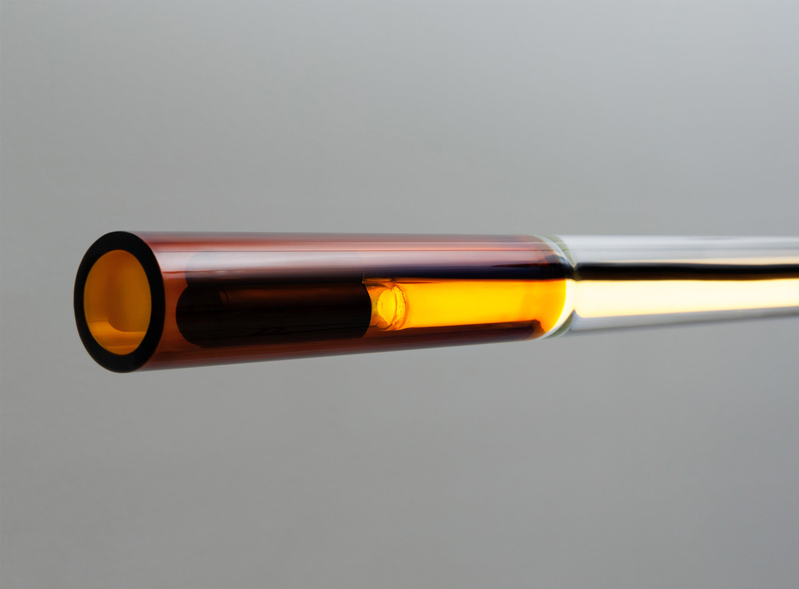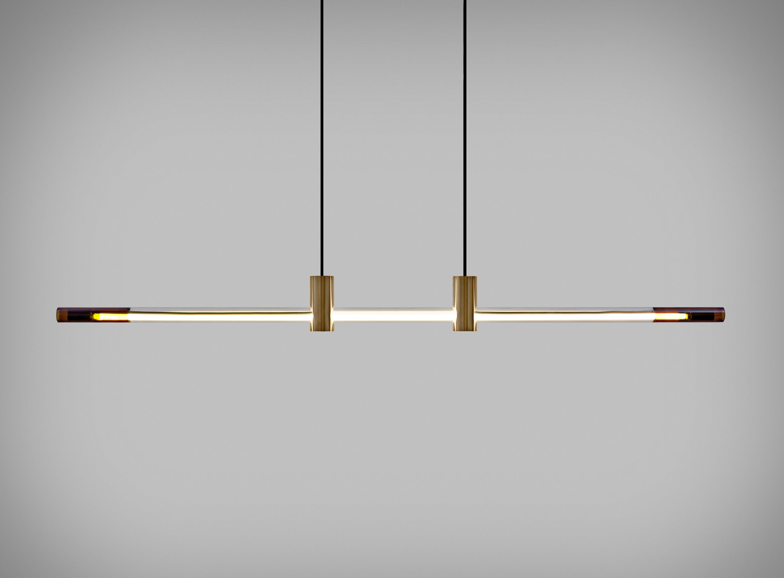 Line is distinguished by a marked opposition between heaviness and lightness. The pyrex tube that pierces the supports in solid bronze accentuates this rivalry. The amber tips emphasize the simplicity of the straight line.