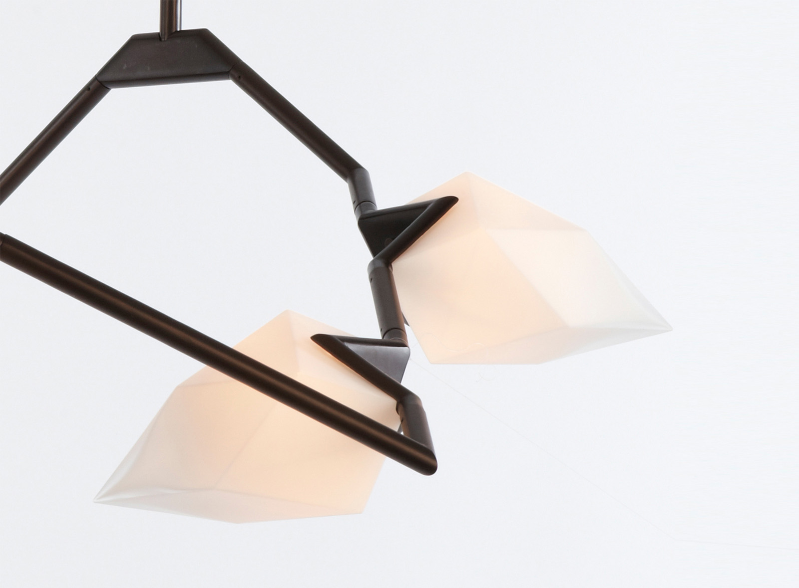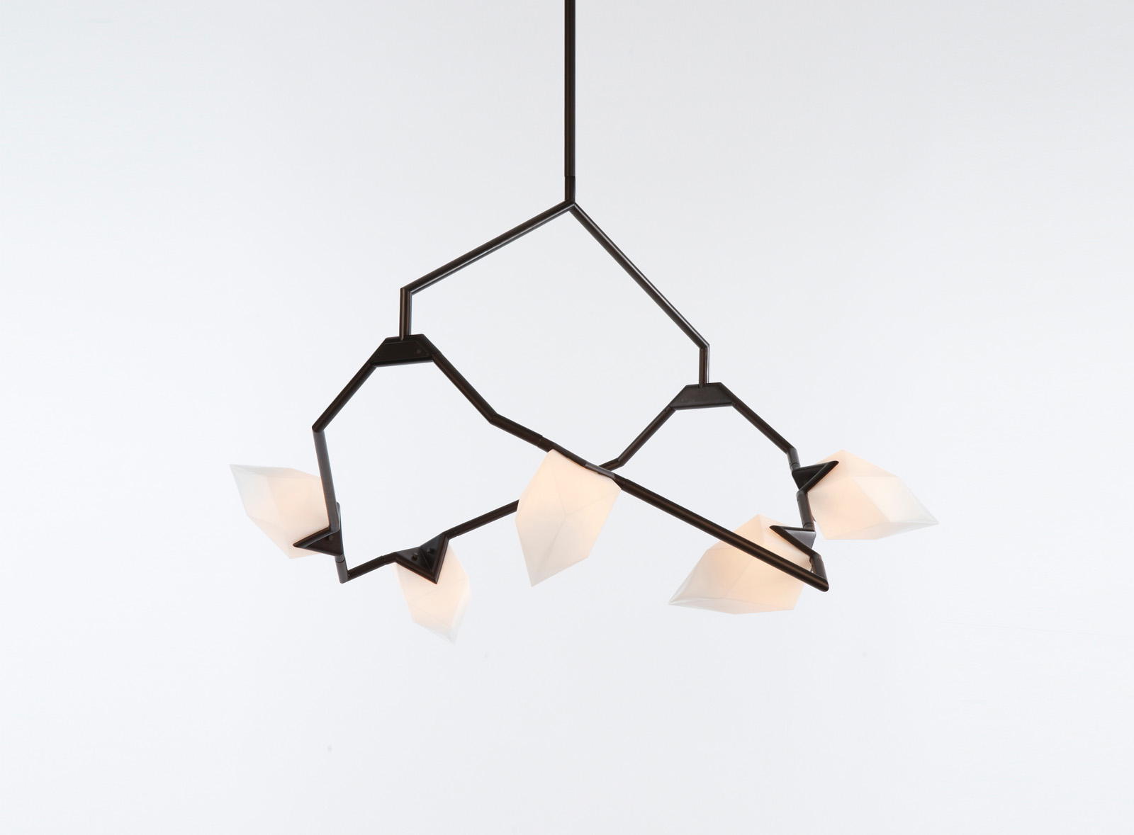 Crystals need an armature on which to grow, and the beauty of that process is the randomness with which they attach themselves to it. And just as when growing crystals break the line of that armature, Seed’s frame is marked with a small “v” where the lights attach to it — a deliberate structural anomaly — symbolizing the imperfections of a natural process. Seed’s glass shades are mold-blown and then cold-worked to make their facets particularly sharp.
