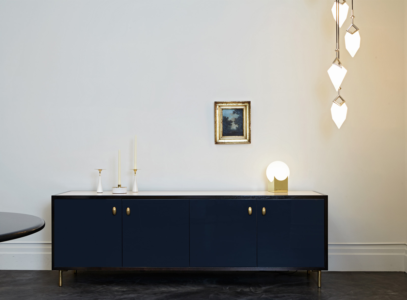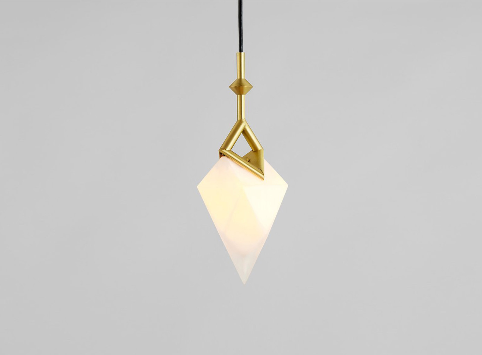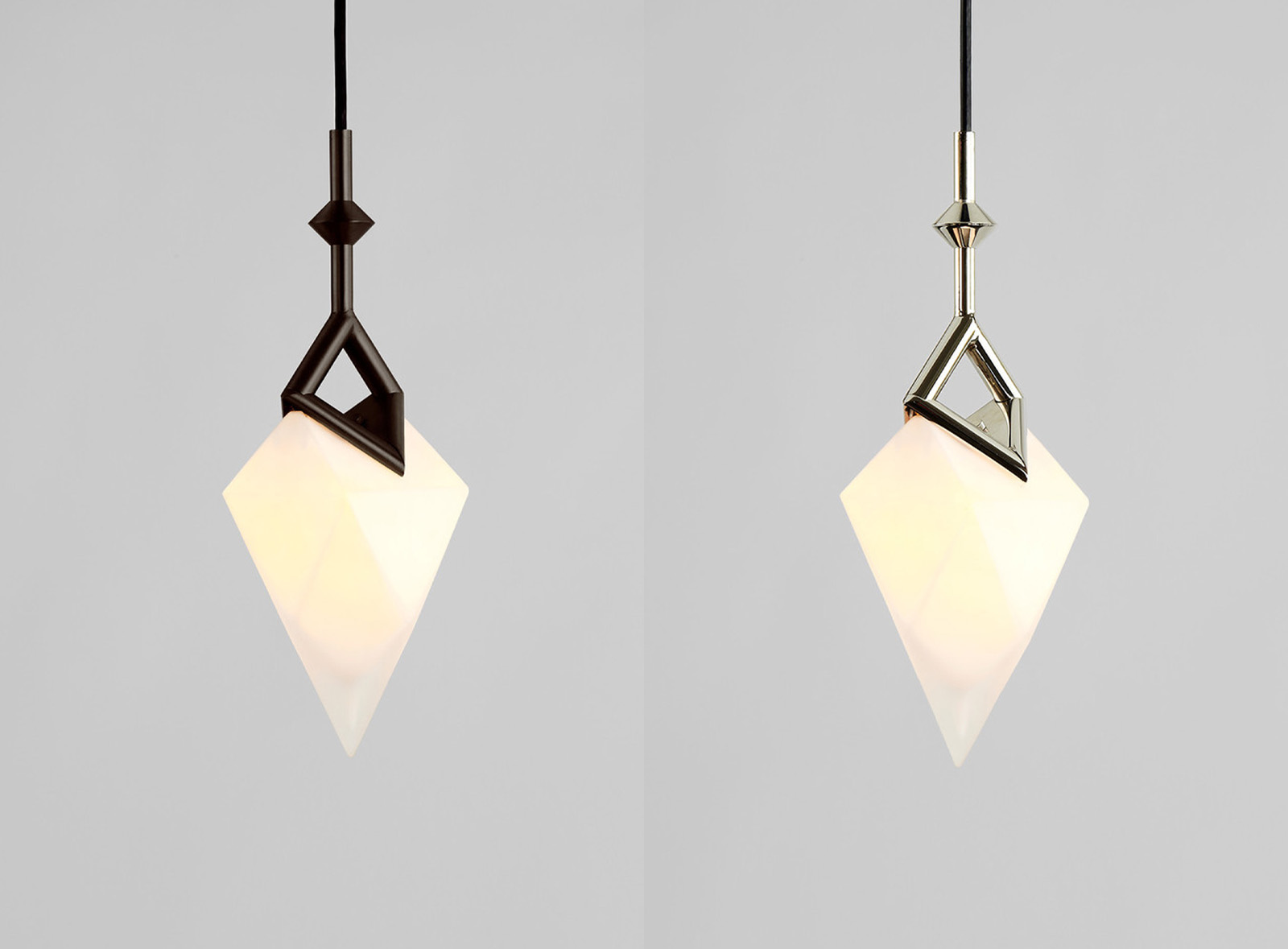 Crystals need an armature on which to grow, and the beauty of that process is the randomness with which they attach themselves to it. And just as when growing crystals break the line of that armature, Seed’s frame is marked with a small “v” where the lights attach to it — a deliberate structural anomaly — symbolizing the imperfections of a natural process. Seed’s glass shades are mold-blown and then cold-worked to make their facets particularly sharp.
