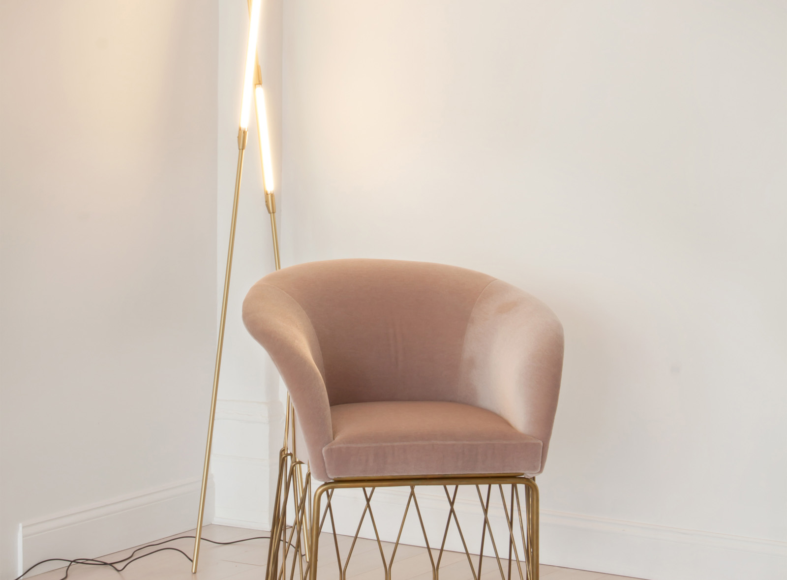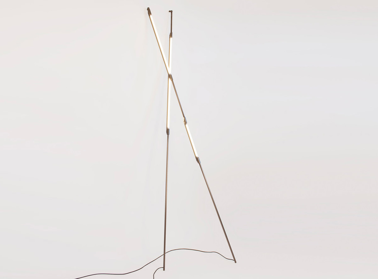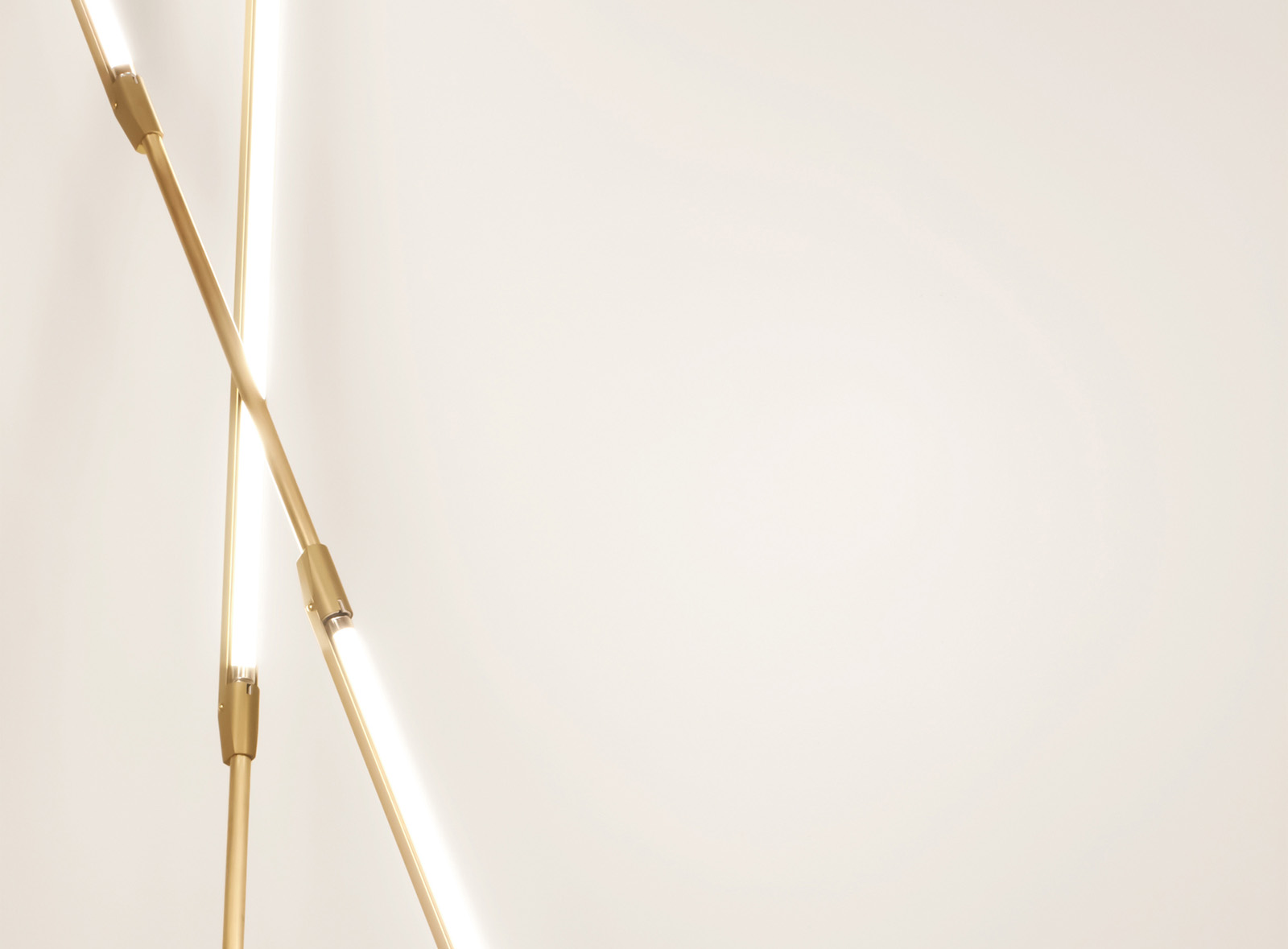 SHY creates form with lines of light; thin LED tubes, with their spare beauty, define the edges of its shape. Thus, the function of the piece and its form are inseparable, and the ethereal quality of the LEDs is balanced by the warmth of brass. SHY’s modular hardware lends itself to a myriad of configurations, both standard and custom, producing new shapes according to what a space demands.
