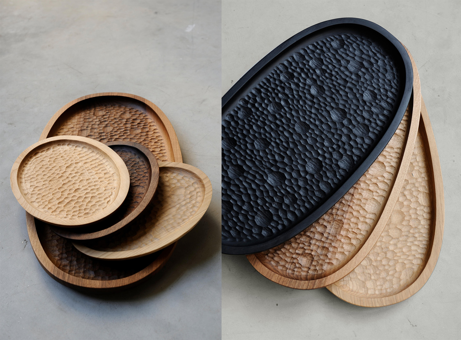 Touch Trays are a part of the Touch collection consisting of benches, trays and other objects. Their special quality lies in the handcarved surfaces that engage our instinctive impulse to feel something, and reflect our hunger for more tactile surroundings in the digital age. The trays are hand-made in Bosnia Herzegovina using Zanat’s wood carving skills. Since the craftsmen carve the trays at random, without drawings — each is unique as no two carved surfaces will ever look the same. Design: Studioilse.