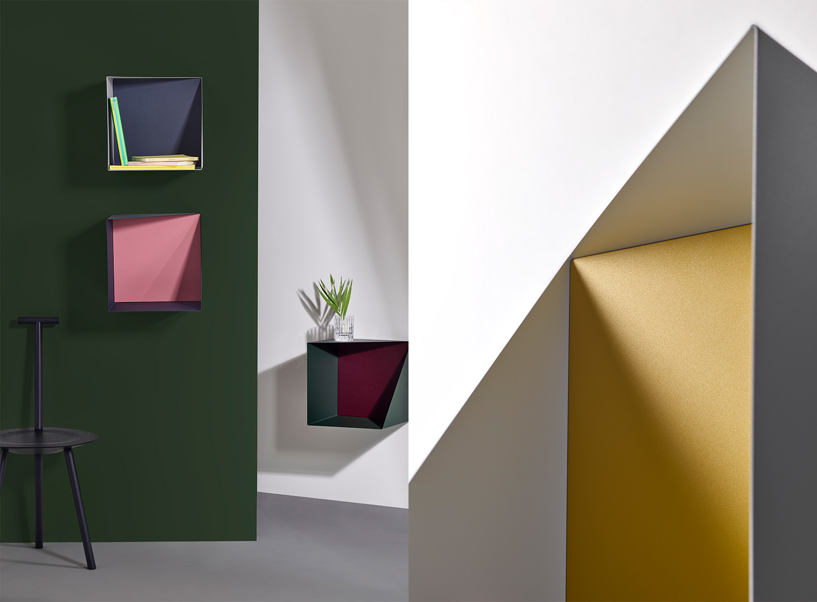 The back plate of the box is removable as it’s attached with magnets. Mix and match colors to create a dynamic flow with a setup of wall boxes in different color combinations. And because of the open side of the box, you can, by rotating the Wall BOX, change the light and visual image. Use it for your records or to show off your book collection. Design: Ludvig Storm.